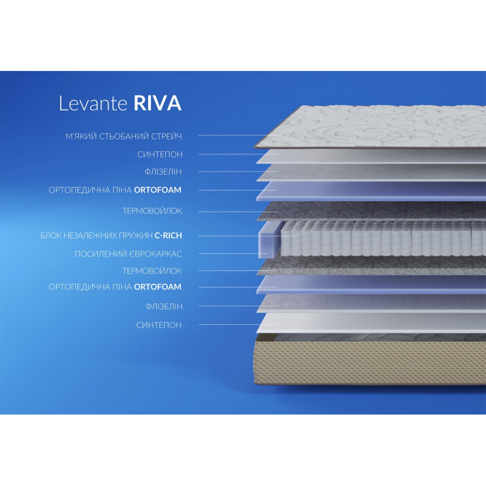 Матрац Levante Riva - двосторонній пружинний матрац з однаковою жорсткістю сторін. Обидві сторони мають среднюю жосткость (3). Висота матраца - 22 см, максимальне навантаження - 140 кг на місце.