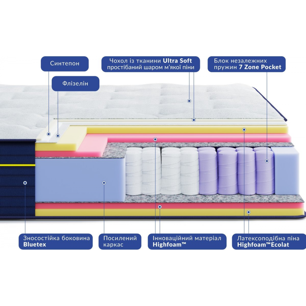Ортопедична піна Highfoam™ рівномірно розподіляє тиск по всій поверхні матраца. Латексована піна Ecolat створює відчуття невагомості і глибокої релаксації, забезпечуючи максимально здоровий сон. Боковини матраца з міцної тканини Bluetex мають високу зносостійкість і стильний сучасний дизайн, що дозволяє зберігати ідеальний зовнішній вигляд матраца навіть після тривалого використання.