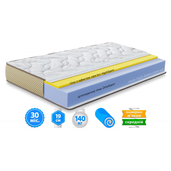 Піна з пам'яттю Highfoam™ - інноваційний матеріал з ефектом пам'яті, повторює контури тіла, оптимально розподіляє навантаження, запобігаючи тиску на кровоносні судини і посилюючи анатомічний ефект матраца. Володіє чудовими ортопедичними властивостями і високою зносостійкістю, має підвищену щільність і жорсткість, не викликає алергічних реакцій. Створює комфортну основу для відпочинку, запобігає втомі під час сну.