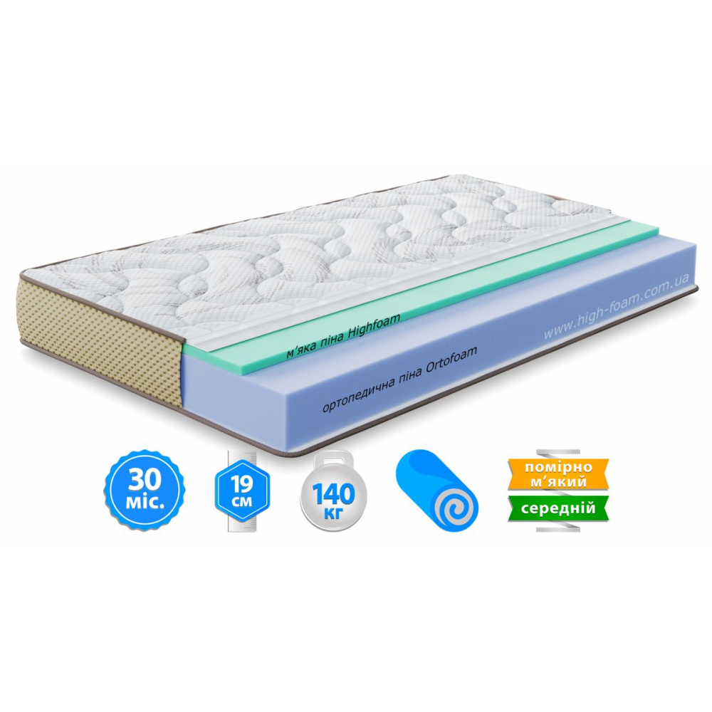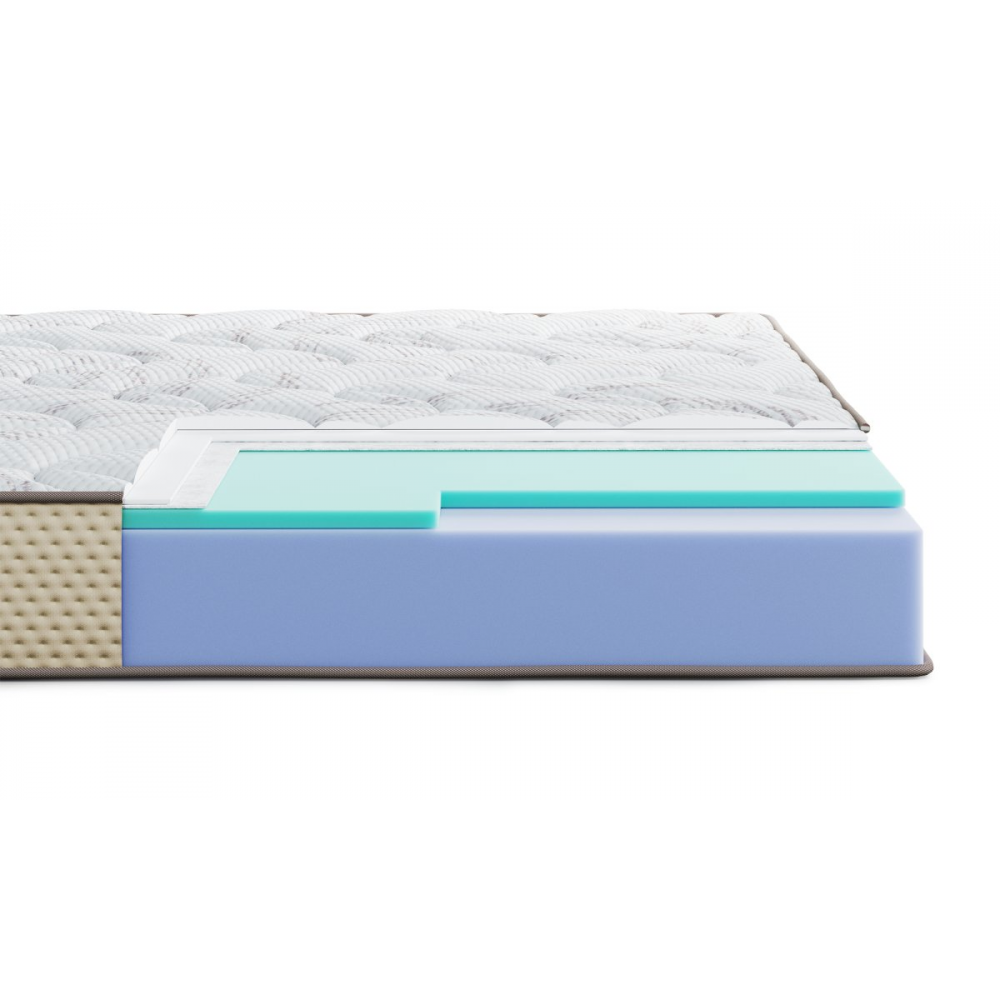 В основі матраца ортопедична піна Ortofoam™ - екологічно чистий матеріал, що забезпечує комфортне і природне положення тіла. Структура комірок пінополіуретану Ortofoam™ оптимально розподіляє навантаження, дозволяє вільно циркулювати повітрю всередині матраца. Піна Highfoam®Sense - гіпоалергенний аналог натурального латексу, з шовковистою поверхнею, високою еластичністю, стійкістю до деформацій і швидким відновленням після стиснення, додає пружність і м'якість.