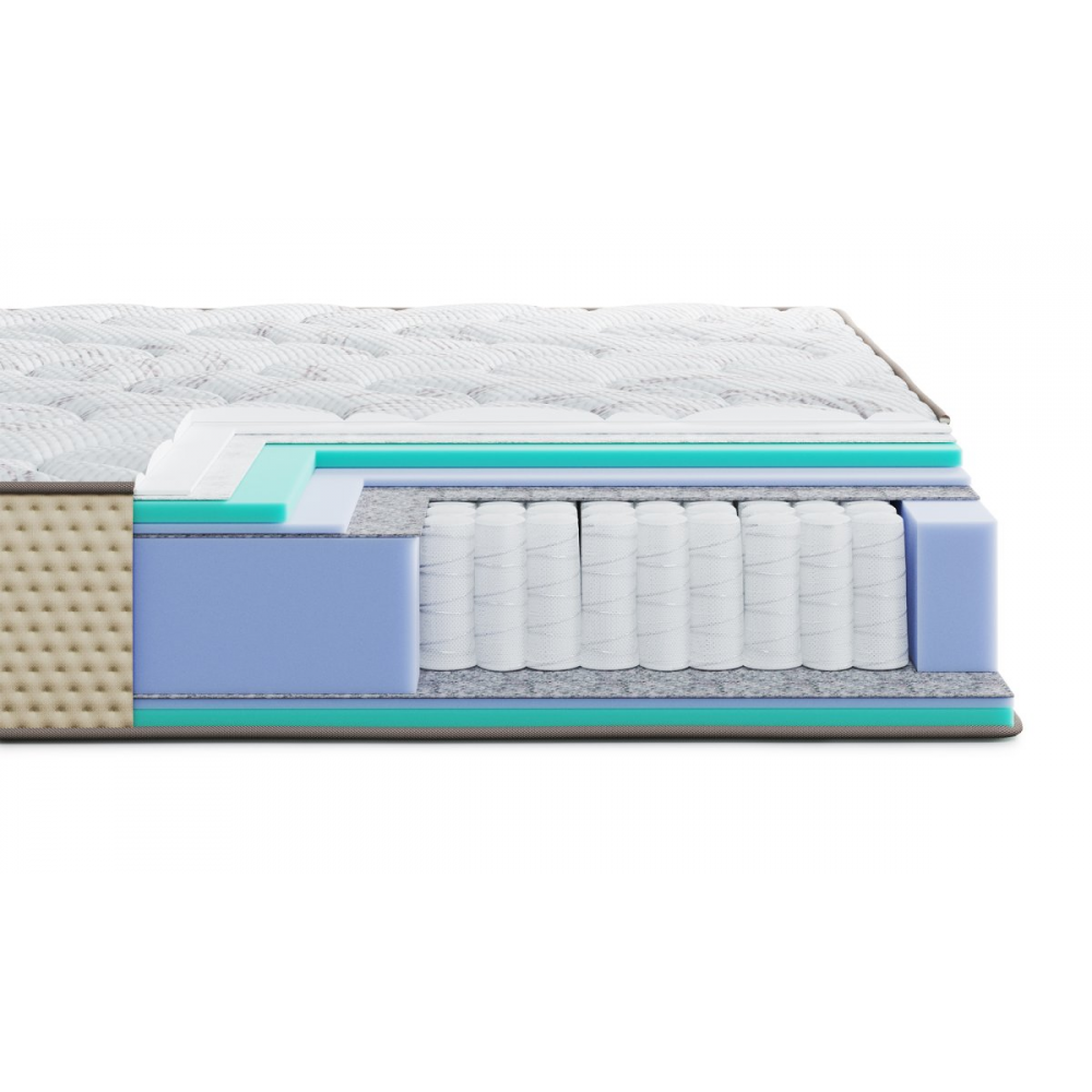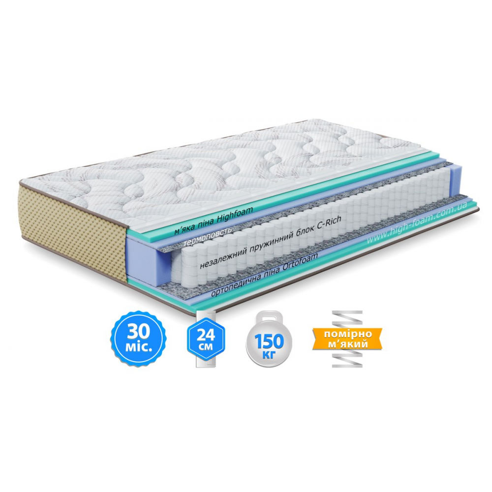 В основе матраса - блок независимых пружин C-Rich, усиленный двумя металлическими рамками, которые придают конструкции повышенную прочность и значительно продлевают срок службы изделия. Каждая пружина работает автономно, точно подстраиваясь под контуры тела и обеспечивая равномерное распределение нагрузки без эффекта «волны». Слои ортопедической пены Ortofoam™, расположенные с обеих сторон, придают матрасу оптимальную упругость, поддерживают правильное положение позвоночника и усиливают ортопедический эффект. Дополнительный слой пены Highfoam® Sense сочетает мягкость и эластичность, обеспечивая точечную поддержку и комфортное положение тела без избыточного давления.