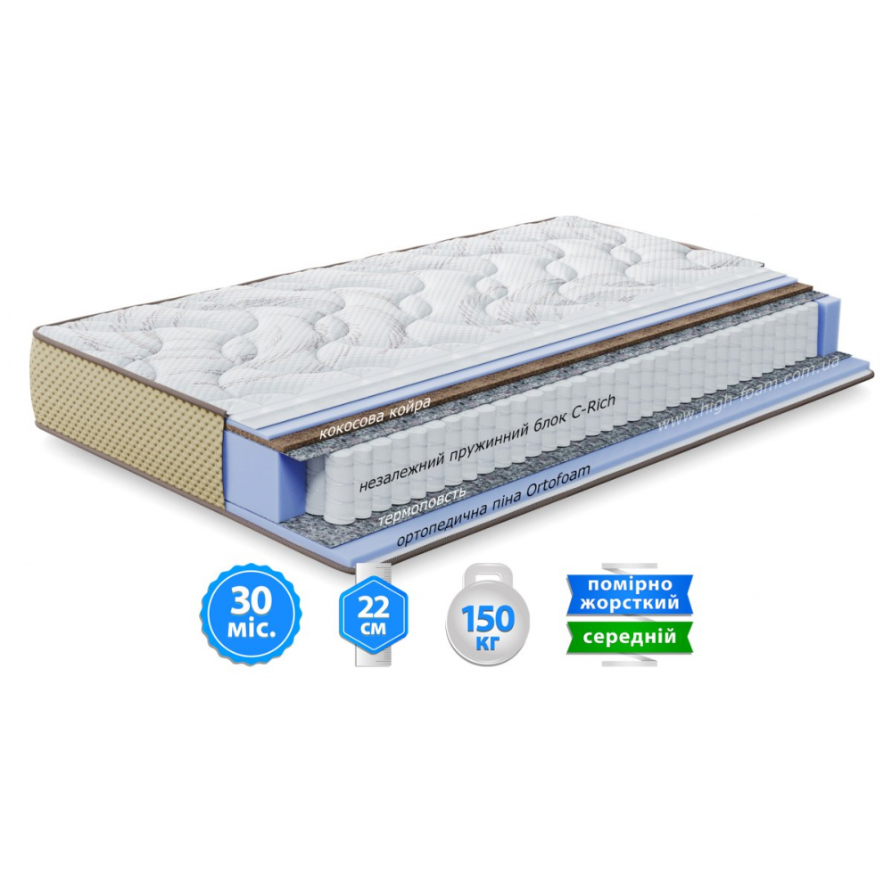 В основе матраса - блок независимых пружин C-Rich, усиленный двумя металлическими рамками, которые придают конструкции повышенную прочность и значительно продлевают срок службы изделия. Каждая пружина работает автономно, точно подстраиваясь под контуры тела и обеспечивая равномерное распределение нагрузки без эффекта «волны». Слой ортопедической пены Ortofoam™ придает матрасу оптимальную упругость, поддерживает правильное положение позвоночника и усиливает ортопедический эффект. Слой кокосовой койры с одной стороны матраса придает жесткость и повышает его ортопедические свойства. Идеально подходит для тех, кто ценит более упругую поддержку.